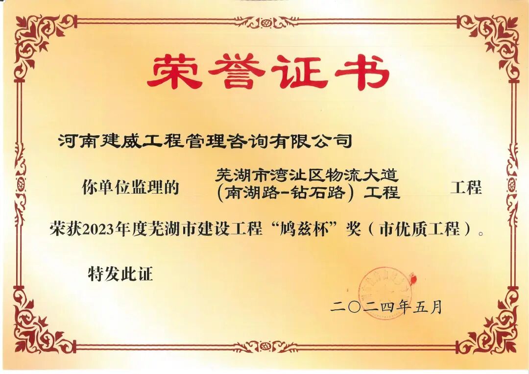 热烈祝贺河南建威工程管理咨询有限公司荣获2023年度芜湖市建设工程“鸠兹杯”奖!发表时间:2024-06-20 10:32 项目概况 物流大道规划道路性质为城市主干路。南起三获路,北至南湖路,道路全6625.656m,预留远期双向10车道建设条件,近期工程按原规划40m红线宽度实施机动车双向6车道、中央绿化带以及两侧侧分带,设计车速60km/h,交通组织方案按照机动车双向车4车道,两侧各设置非机动车和行人慢行交通,限速50km/h。 xiang 项 mu 目 rong 荣 yu 誉 ![]() 河南建威工程管理咨询有限公司监理的芜湖市湾沚区物流大道(南湖路一钻石路)工程荣获了2023年度芜湖市建设工程“鸠兹杯”奖,这是对公司专业能力和工程质量的高度认可。 “鸠兹杯”奖作为芜湖市建设工程领域的最高荣誉,其评选过程严格、标准高,竞争激烈。河南建威工程管理咨询有限公司能够在这场竞争中脱颖而出,充分展示了其在工程管理领域的专业实力和优秀品质。 ![]() 我们深知,每一份荣誉都离不开团队的辛勤工作和不懈追求。这份荣誉不仅是对我们过往工作的肯定,也是对未来工作的激励。河南建威工程管理咨询有限公司将珍惜这份荣誉,继续秉承“专业、诚信、创新、共赢”的企业精神,为客户提供更优质的服务,为社会创造更多的价值。 展望未来,河南建威工程管理咨询有限公司将继续加大技术创新和团队建设力度,不断提升公司的核心竞争力,为我国建设工程领域的繁荣和发展贡献更大的力量。再次对河南建威工程管理咨询有限公司荣获2023年度芜湖市建设工程“兹杯”奖表示热烈的祝贺! ![]() ![]() |
