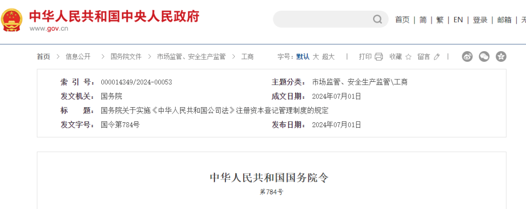 第一条 为了加强公司注册资本登记管理,规范股东依法履行出资义务,维护市场交易安全,优化营商环境,根据《中华人民共和国公司法》(以下简称公司法),制定本规定。第二条 2024年6月30日前登记设立的公司,有限责任公司剩余认缴出资期限自2027年7月1日起超过5年的,应当在2027年6月30日前将其剩余认缴出资期限调整至5年内并记载于公司章程,股东应当在调整后的认缴出资期限内足额缴纳认缴的出资额;股份有限公司的发起人应当在2027年6月30日前按照其认购的股份全额缴纳股款。公司生产经营涉及国家利益或者重大公共利益,国务院有关主管部门或者省级人民政府提出意见的,国务院市场监督管理部门可以同意其按原出资期限出资。第三条 公司出资期限、注册资本明显异常的,公司登记机关可以结合公司的经营范围、经营状况以及股东的出资能力、主营项目、资产规模等进行研判,认定违背真实性、合理性原则的,可以依法要求其及时调整。第四条 公司调整股东认缴和实缴的出资额、出资方式、出资期限,或者调整发起人认购的股份数等,应当自相关信息产生之日起20个工作日内通过国家企业信用信息公示系统向社会公示。第五条 公司登记机关采取随机抽取检查对象、随机选派执法检查人员的方式,对公司公示认缴和实缴情况进行监督检查。公司登记机关应当加强与有关部门的信息互联共享,根据公司的信用风险状况实施分类监管,强化信用风险分类结果的综合应用。第六条 公司未按照本规定调整出资期限、注册资本的,由公司登记机关责令改正;逾期未改正的,由公司登记机关在国家企业信用信息公示系统作出特别标注并向社会公示。第七条 公司因被吊销营业执照、责令关闭或者被撤销,或者通过其住所、经营场所无法联系被列入经营异常名录,出资期限、注册资本不符合本规定且无法调整的,公司登记机关对其另册管理,在国家企业信用信息公示系统作出特别标注并向社会公示。第八条 公司自被吊销营业执照、责令关闭或者被撤销之日起,满3年未向公司登记机关申请注销公司登记的,公司登记机关可以通过国家企业信用信息公示系统予以公告,公告期限不少于60日。公告期内,相关部门、债权人以及其他利害关系人向公司登记机关提出异议的,注销程序终止。公告期限届满后无异议的,公司登记机关可以注销公司登记,并在国家企业信用信息公示系统作出特别标注。第九条 公司的股东或者发起人未按照本规定缴纳认缴的出资额或者股款,或者公司未依法公示有关信息的,依照公司法、《企业信息公示暂行条例》的有关规定予以处罚。第十条 公司登记机关应当对公司调整出资期限、注册资本加强指导,制定具体操作指南,优化办理流程,提高登记效率,提升登记便利化水平。第十一条 国务院市场监督管理部门根据本规定,制定公司注册资本登记管理的具体实施办法。第十二条 上市公司依照公司法和国务院规定,在公司章程中规定在董事会中设置审计委员会,并载明审计委员会的组成、职权等事项。来源 | :中国政府网、新华社。(声明:版权归原作者所有,如有问题请联系删除,我方转载的目的在于传递更多信息及分享,不构成任何建议及观点。本文内容仅代表作者个人观点,本平台不承担不当转载或引用本文内容而产生纠纷的法律责任。)